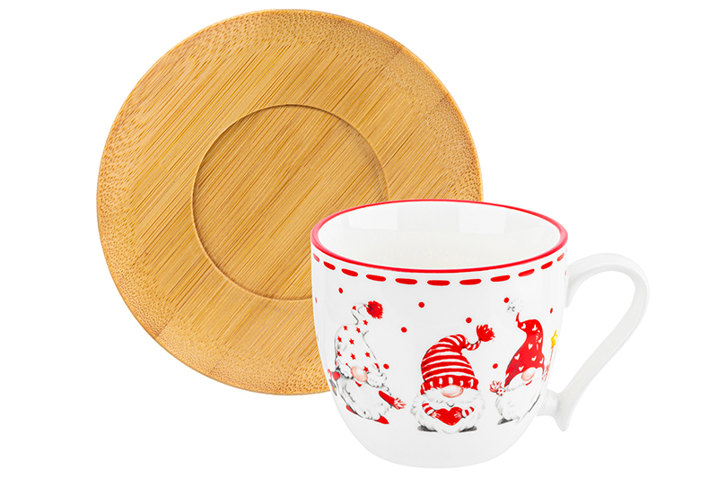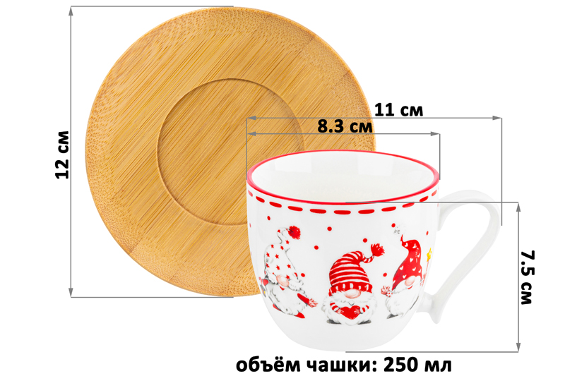 Чашка для капучино и кофе латте из серии «Весёлые гномики» от Elan Gallery предназначена для эстетичной сервировки стола. Размер ёмкости – 11х8,3х7,5 см, объём – 250 мл. Выполнена из высококачественного белого фарфора. Он не впитывает цвет напитков и легко отмывается, благодаря чему надолго сохранит свою белизну. Поверхность изделия украшает яркий рисунок в виде забавных гномиков. Подставка выполнена из натурального бамбука. Диаметр подставки – 12 см. Кофейная кружка поможет вам провести множество приятных завтраков с капучино и латте, а также уютные чайные вечера с конфетами, вафлями и другими десертами и сладостями. Подойдёт ценителям чая и кофе, которые любят пить из красивой и необычной посуды. Согрейтесь зимой любимым напитком: како с маршмэллоу, ягодным чаем или горячим шоколадом. Летом освежитесь домашним лимонадом или морсом. Декоративное изделие позволит организовать запоминающееся чаепитие. Деревянная подставка не только послужит стильным акцентом, но и защитит поверхность от воздействия высоких температур. Фарфоровая посуда с изображением маленьких новогодних помощников привнесёт в любое помещение дух волшебства и праздника! Это оригинальный элемент вашего декора. Не рекомендуется применять абразивные моющие средства. Без бамбуковой подставки кружка подходит для использования в посудомоечной машине и микроволновой печи. Бамбук нельзя замачивать! Поставляется в дизайнерской картонной коробке – благодаря ей вам не потребуется дополнительная подарочная упаковка. Изделие станет прекрасным сувениром на память и отличным подарком для друзей и близких. Серия «Весёлые гномики» от бренда Элан Галерея поможет вам погрузиться в атмосферу Нового года и Рождества и наполнит ваш дом зимним уютом!