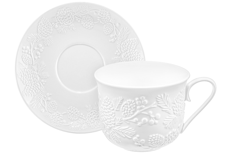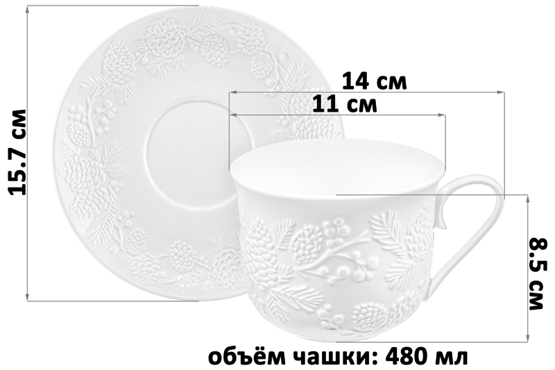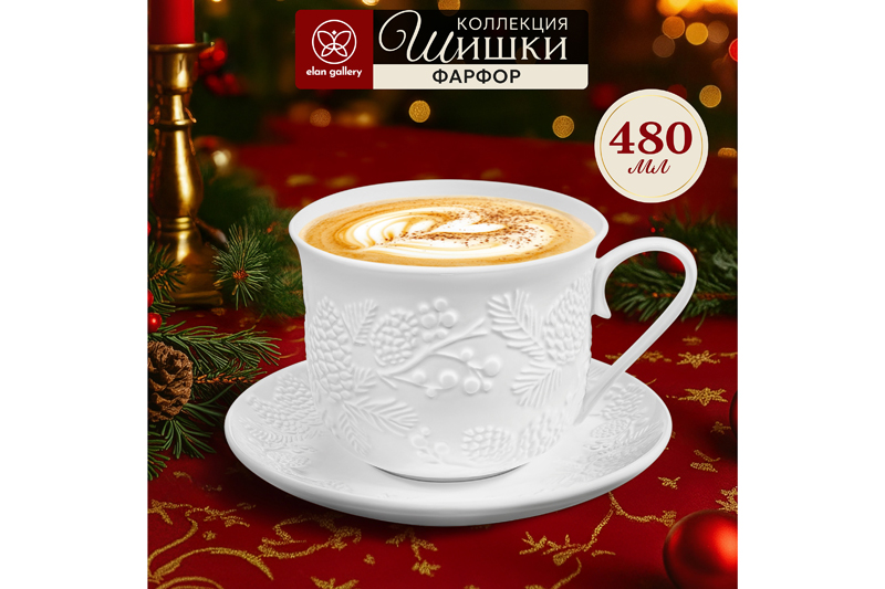Чайная пара Elan Gallery "Шишки" выполнена из белого фарфора. Объём чашки – 480 мл, размер – 14х11х8,5 см. Размер блюдца – 15,7х15,7х2,7 см. "Шишки" – это коллекция фарфоровой посуды, вдохновлённая атмосферой хвойного леса. Белоснежная поверхность изделий украшена утончённым рельефом веточек и шишек. Природные мотивы наполнят вашу сервировку уютом и ощущением светлого праздника. Подарите себе мгновения тишины и свежести – с дыханием леса и тонкой красотой в каждой детали. Кружка и десертное блюдечко подходят ценителям чая и кофе, которые любят пить из красивой и необычной посуды. Посуда украсит ваш стол своим стильным дизайном как на праздник, так и в будни. Это идеальный вариант для того, чтобы согреться горячим чаем зимой и освежиться прохладным лимонадом летом. Используйте блюдце как подставку для кружечки, чтобы порадовать гостей изящной сервировкой. Положите на тарелку кусочек торта, домашнего пирога или пирожное. Она подойдёт не только для десерта, но и закусок: сырной нарезки, сырокопчёной колбасы или свежих овощей и зелени. Не рекомендуется применять абразивные моющие средства. Набор можно использовать в микроволновой печи и посудомоечной машине. Поставляется в красивой картонной коробке. Станет приятным подарком вашим близким на любой праздник. Благодаря стильной коробочке не понадобится подарочная упаковка. Чашка с десертной тарелочкой станут украшением вашей кухни или приятным сюрпризом для близких!