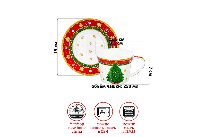 Чайная пара 2 пр. 250 мл 12,5*9,5*7 см "Новогодняя ёлка" красный узор NEW BONE CHINA