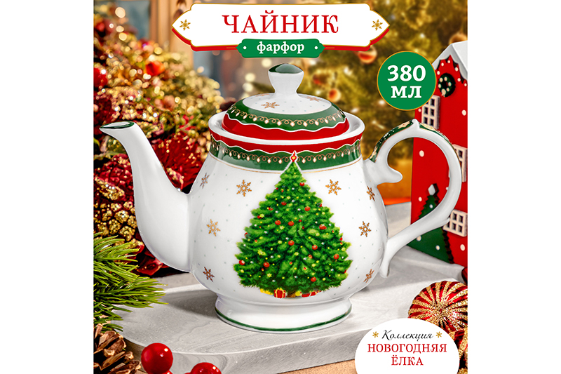 Чайник 380 мл 17*10*12 см "Новогодняя елка" зеленый узор NEW BONE CHINA