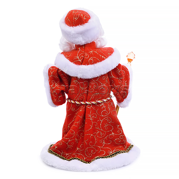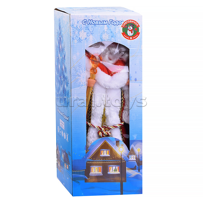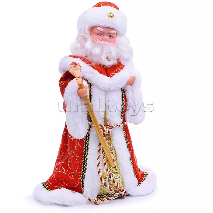 Дедушка Мороз с посохом в красной шубе с узорами, музыкальный 40см в коробке