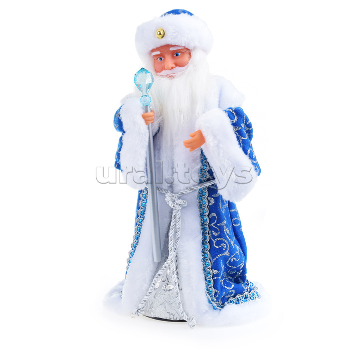 Дедушка Мороз с посохом в синей шубе с серебристыми узорами, музыкальный 40см в коробке