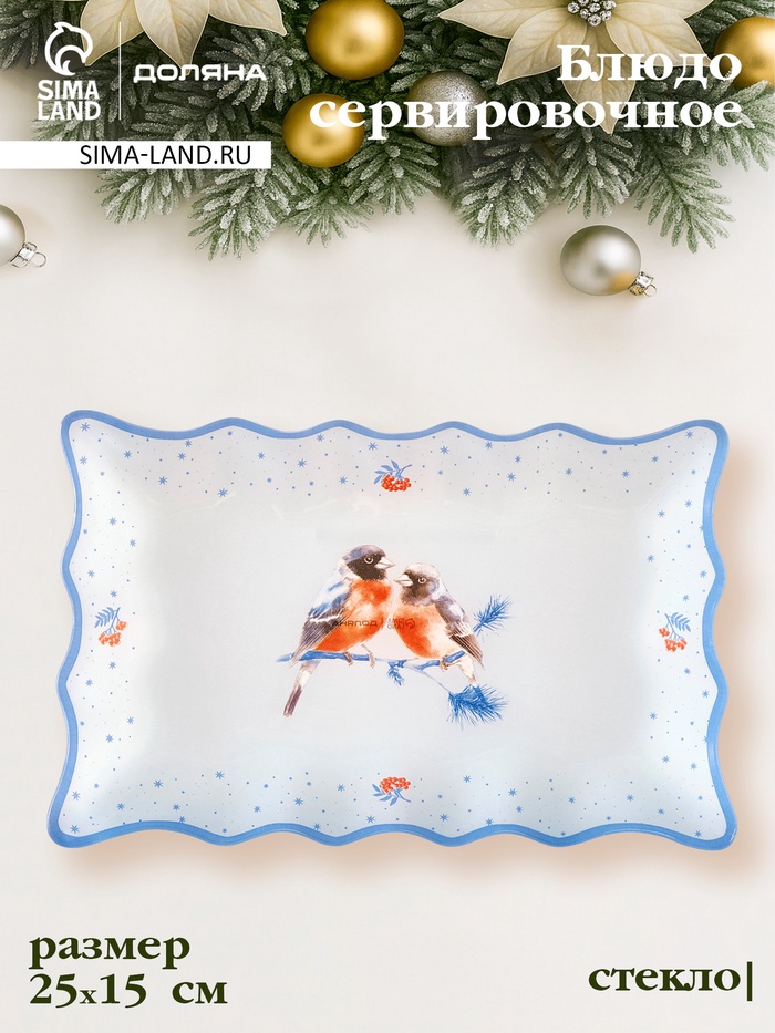 Пусть зимняя сказка начнётся с сервировки! Новогоднее прямоугольное стеклянное блюдо в бело-голубых тонах с изображением птиц на фоне зимнего пейзажа. Оно создано как для повседневного использования, так и для того, чтобы подчеркнуть праздничную атмосферу и аккуратно разместить угощения на новогоднем столе.
