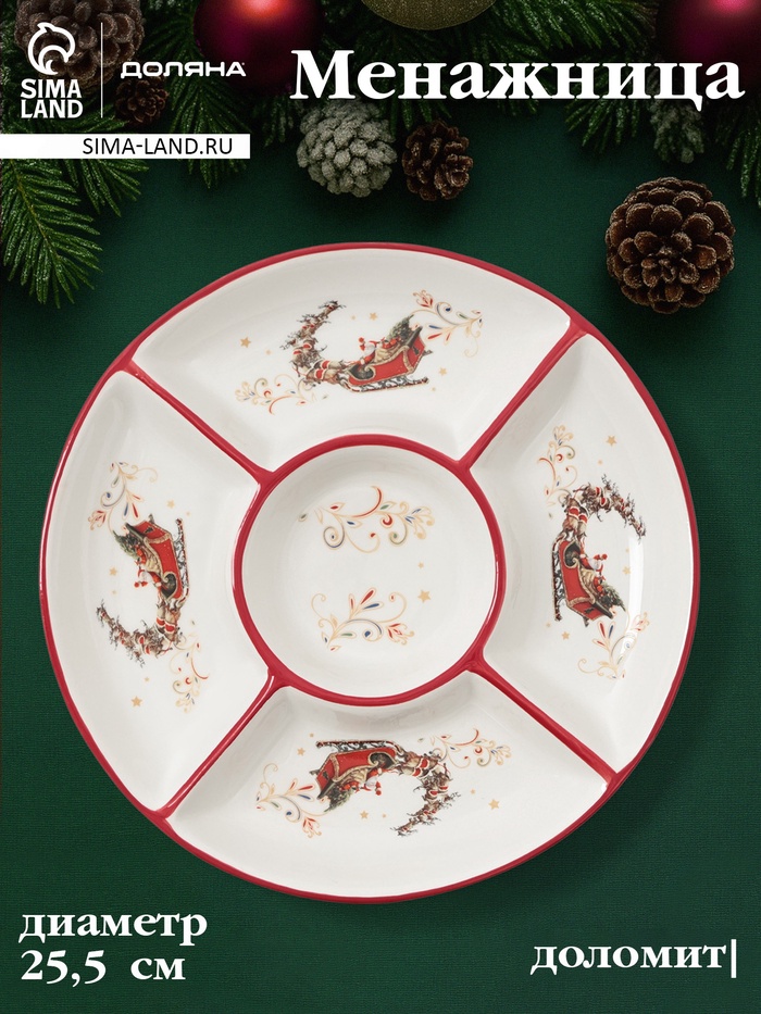 Новогодняя менажница с рисунком саней — не просто ёмкость для закусок, а умный организатор праздничного стола. Пять ячеек в круглой композиции позволяют разделить оливье, винегрет, селёдку под шубой, маринованные огурцы и маслины — без смешивания, без суеты. Белая керамика и деликатный рисунок добавляют лёгкую праздничную ноту, не перегружая сервировку.