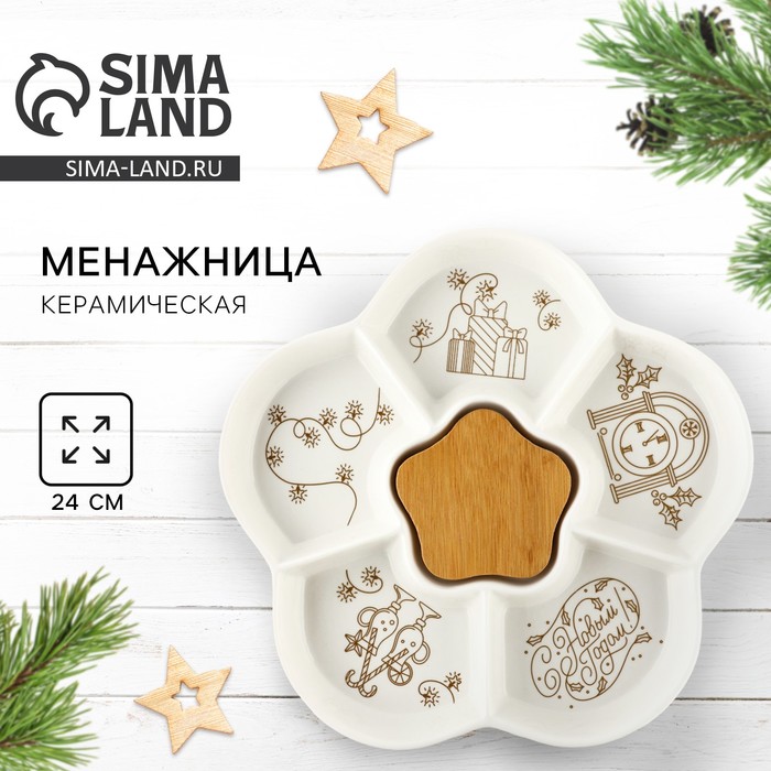 Менажница керамическая новогодняя диаметром 24 см станет отличным дополнением к вашему праздничному столу. Она выполнена из высококачественной керамики, которая не впитывает запахи и легко моется. Благодаря компактным размерам менажницу можно использовать как для подачи закусок, так и для сервировки основных блюд.