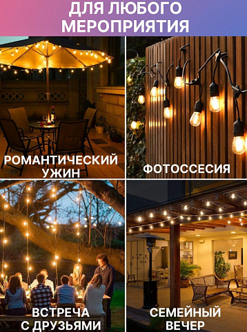 Если длины уличной гирлянды не достаточно, можно соединить четыре гирлянды в одну цепь. Лампы гирлянды золотистого тёплого желтого цвета. Свечения от ламп шариков достаточно, чтобы осветить большой участок дома, улицы, террасы, патио, сада, уличный домик. Соединитель у гирлянды водонепроницаемый, выдерживает капли воды. Гирлянда упакована в в мягкий материал, который защищает от механических воздействий и в крафтовую коробку, готовый подарок на праздник. Электрогирлянда подходит для украшения фасада дома, сада, дачи, фотозоны, бара, ресторана, кафе, веранды, террасы, создания уютной обстановки на балконе, кухне, гостиной, в детской комнате, на окнах, как занавес штора или ночной светильник в спальне, фонарь на улицу, фонарик для сада, украшение для сада.