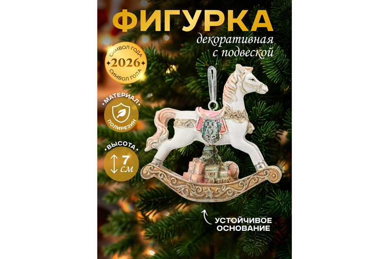 Декоративная фигурка Elan Gallery "Лошадка-качалка с подарками" размером 7,5х2х7,5 см способна преобразить любое помещение. Статуэтка в виде белой лошади выполнена из полирезина, имеет подвес из ленточки. Полирезин – это современный материал, который славится своей лёгкостью, устойчивостью к влаге и солнечным лучам. Он не выделяет вредных веществ и не имеет запаха. Полирезин легко поддается обработке, поэтому изделия из него славятся своей реалистичностью и проработанными деталями. Подвесная фигурка выполнена в нежных белых и розовых цветах, украшена мелкими блёстками. Привнесите эстетику в интерьер своей квартиры или дачи с помощью красивых мелочей! Можно использовать как новогоднюю ёлочную игрушку, а также в роли праздничного декора по любому поводу. Фигурка с петелькой украсит интерьер гостиной или спальни и создаст тёплую атмосферу. Вы можете разместить сувенир на полке, столе или создать декоративную композицию вместе с другими украшениями на камине. Она поможет украсить ваше рабочее место в офисе и сделает кабинет уютнее! Не рекомендуется применять абразивные моющие средства. В коллекции бренда Элан Галерея представлено много товаров для дома, предметов декора и сувенирной продукции для создания уюта в любом пространстве. Статуэтки милых животных – это всегда приятный сюрприз для мальчика или девочки. Такой сувенир уместен для любого возраста. Фигура станет чудесным подарком на долгую память в честь любого праздника, в том числе на Новый год и Рождество. Пусть милая фигурка станет символом вашей дружбы и создаст хорошее настроение взрослым и детям!