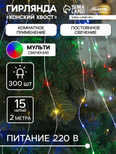 [Конский хвост. Эффектная гирлянда в виде пучка светодиодных нитей, соединённых в одном основании, свободно свисающих вниз. Серия гирлянд ROSA предлагает122][Ip 20. Устройство защищено от твердых объектов диаметром больше 12,5 мм и не защищено от проникновения воды.122][Цвет свечения: мульти, белый, тёплый бедрый, синий, фиолетовый, желтый, зеленый, красный. Цвет нити: серебристый, медный122]