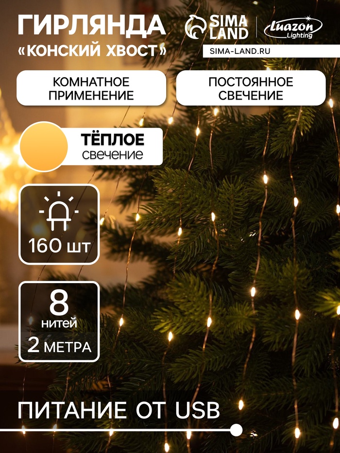 [Конский хвост. Эффектная гирлянда в виде пучка светодиодных нитей, соединённых в одном основании, свободно свисающих вниз. Серия гирлянд ROSA предлагает122][Ip 20. Устройство защищено от твердых объектов диаметром больше 12,5 мм и не защищено от проникновения воды.122][Цвет свечения: мульти, белый, тёплый бедрый, синий, фиолетовый, желтый, зеленый, красный. Цвет нити: серебристый, медный122]Комплектация