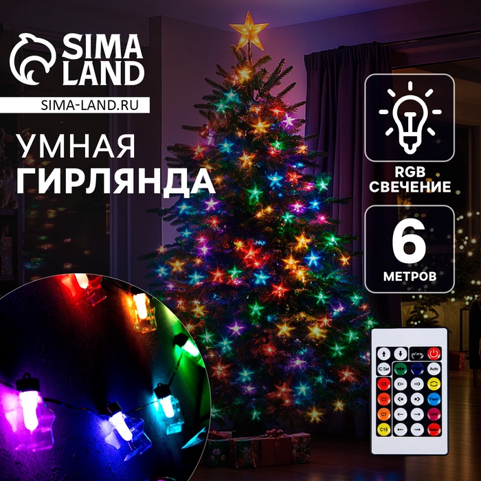 Умная гирлянда «Нить» 6 м с насадками «Звёздочки», IP20, тёмная нить, 20 LED, свечение RGB, USB