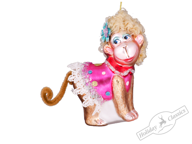 Новогодняя игрушка на елку из стекла - мартышка в розовом платье. Мартышку украшают шикарные светлые волосы и гнущийся хвостик. Яркий наряд обезьяны привлечет внимание к вашей елочке и никого не оставит равнодушным. Специальная коллекция