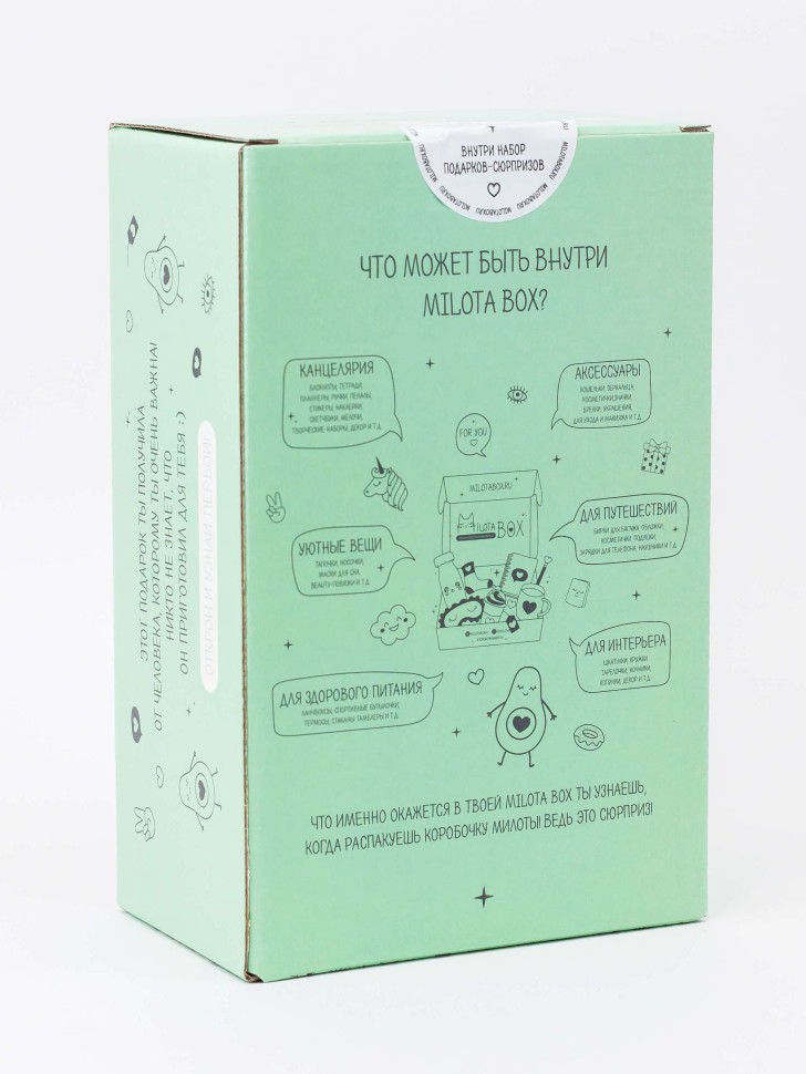 Каждая коробочка милоты наполнена необычными вещицами, которыми будет приятно пользоваться в повседневной жизни: милая канцелярия, уютные товары для дома, стильные аксессуары, предметы для здорового образа жизни и приятные мелочи. Внутри Milota BOX находится до 8 сюрпризов, упакованных в стилизованную подарочную бумагу тишью.