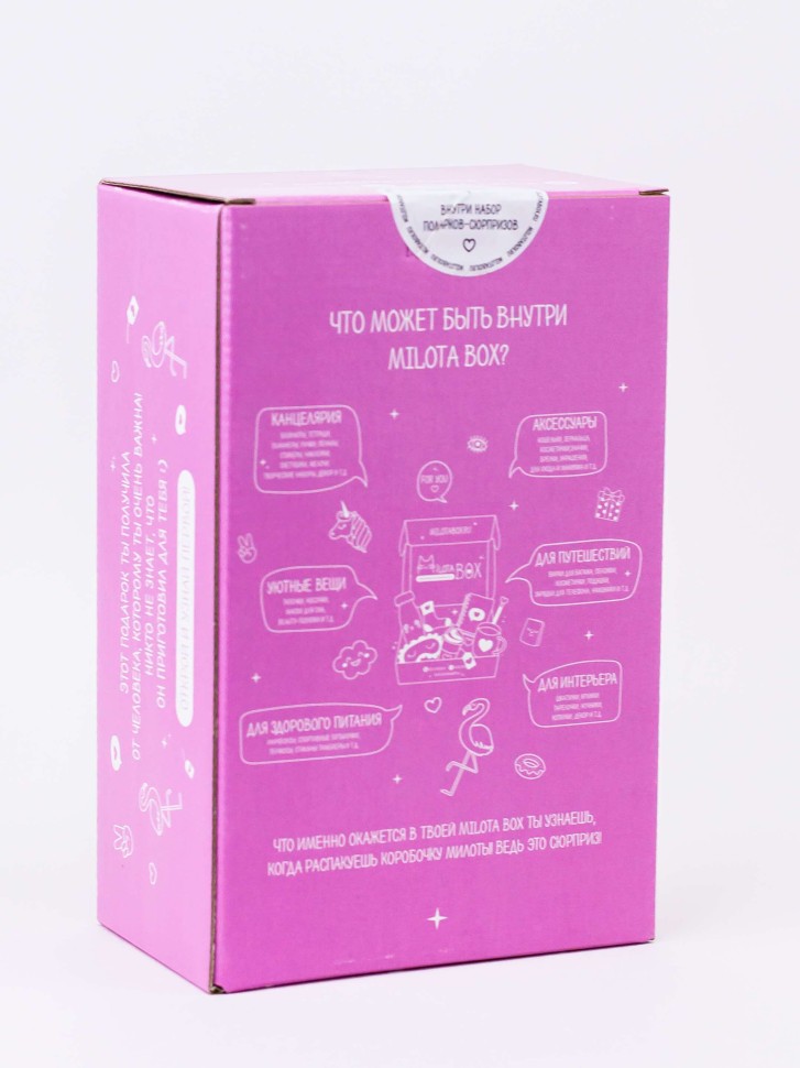 Каждая коробочка милоты наполнена необычными вещицами, которыми будет приятно пользоваться в повседневной жизни: милая канцелярия, уютные товары для дома, стильные аксессуары, предметы для здорового образа жизни и приятные мелочи. Внутри Milota BOX находится до 8 сюрпризов, упакованных в стилизованную подарочную бумагу тишью.