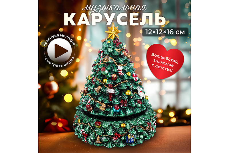 Музыкальная карусель «Рождественская ель» от Elan Gallery – это маленькое путешествие в дивный мир зимней сказки. Её размер – 12x12x16 см. Выполнена из полистоуна – современного материала, который славится своей прочностью, износостойкостью и устойчивостью к перепадам температур. Он не подвержен деформации и не выделяет вредных веществ. Полистоун легко поддаётся обработке, поэтому изделия из него отличаются высокой детализацией. На красивой зелёной ёлке развешаны новогодние украшения: шары, конфеты и другие символы праздника. Поверхность присыпана блёстками, напоминающими снежинки. Верхушку венчает большая золотая звезда. Основание оснащено мягким противоскользящим покрытием. Механическое изделие не требует зарядки и батареек – достаточно повернуть верхнюю часть ёлки по линии механизма. Крутящаяся фигурка проигрывает приятную рождественскую музыку, навевая воспоминания о тёплых вечерах, проведённых в кругу семьи. Время – 3-4 минуты в зависимости от силы завода. Поставьте милую настольную фигурку на комод, полку или возле компьютера, чтобы добавить интерьеру дух любимых зимних праздников. Оригинальная игрушка в стиле винтаж станет прекрасным сувениром на память и отличным подарком для друзей и близких. Благодаря яркому дизайну фигурное декоративное изделие понравится ребёнку, подростку или взрослому. Подойдёт как девочке, так и мальчику. Оно послужит необычным инвентарём для декора вашего дома. Поставляется в красной картонной коробке – благодаря ей вам не потребуется дополнительная подарочная упаковка. Музыкальная карусель от бренда Элан Галерея поможет вам погрузиться в атмосферу Нового года и Рождества и наполнит дом уютом и светлой праздничной магией! /