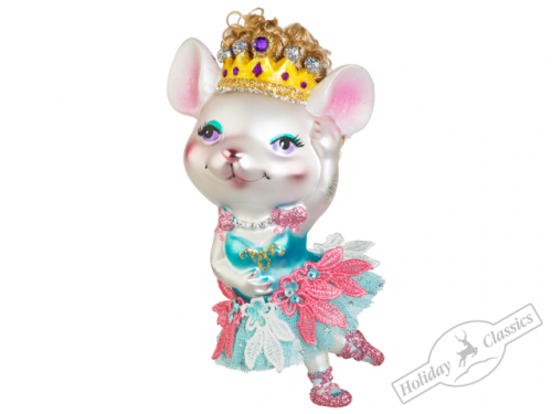 Фигурка мыши - украшение на ёлку из коллекции стеклянных символов года Holiday Classics. При взгляде на эту маленькую мисс не остаётся сомнений, кто в этом году настоящая "Королева бала"! На мышке бальное платье с пышной юбкой, выполненное в нежных пастельных розово-голубых тонах а на голове красуется золотая корона, убранная крупными драгоценными камнями. Перед нами по-настоящему коллекционное изделие. Дизайнеры уделили много внимания оформлению мелких деталей игрушки - у нашей мышки на голове "настоящие" волосы, а на "лице" - вечерний макияж! Это хороший подарок - знак внимания и пожелание счастья - другу, коллеге, любому близкому человеку. Ещё больше стеклянных, керамических и прочих символов года вы найдёте на нашем сайте. Специальная коллекция