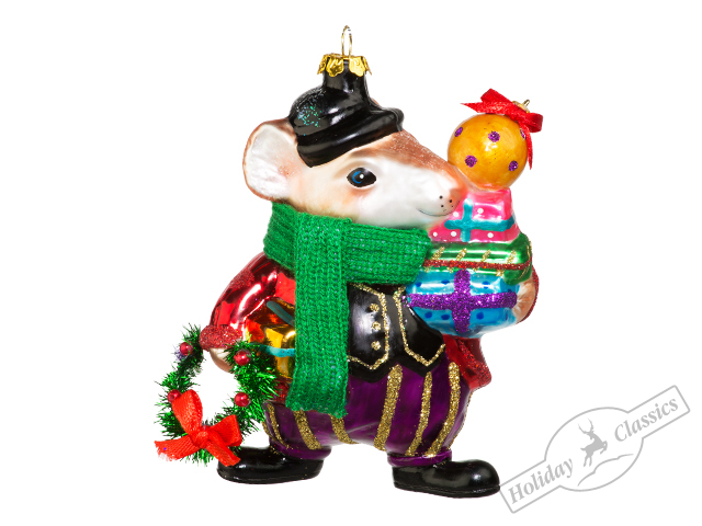 Фигурка мыши - украшение на ёлку из коллекции стеклянных символов года Holiday Classics. Этот мистер основательно подготовился к долгожданным зимним праздникам! К черному жакету и фиолетовым брюкам в золотистую полоску мышонок добавил плотный зелёный шарф, еловую веточку с красным бантом и, конечно, целую гору подарков. Повезёт тем, к кому в гости в Новогоднюю ночь придёт такой щедрый, одетый с иголочки, волшебный гость. Отличная ёлочная игрушка - символ грядущего года - выполнена с большим вниманием к мелочам и художественно оформлена с использованием натуральных материалов и качественных красок. Ещё больше стеклянных, керамических и прочих символов года вы найдёте на нашем сайте! Специальная коллекция