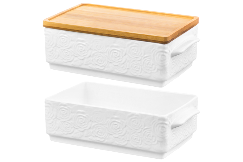 Набор 2 блюд для холодца из серии «Розы» от Elan Gallery предназначен для эстетичной сервировки вашего стола. Размер каждого изделия – 20,5х11,5х5,6 см, объём – 800 мл, внутренний размер – 17х11 см. Выполнены из высококачественного белого фарфора. Он не впитывает цвет продуктов и легко отмывается, благодаря чему надолго сохраняет свою белизну. Поверхность изделий украшают рельефные узоры в виде пышных бутонов роз. Крышка выполнена из натурального бамбука. Вместительные контейнеры подойдут для сельди под шубой, салатов и плова, и помогут порадовать себя или гостей за праздничным столом. Используйте их в качестве салатников или глубоких сервировочных блюд для эстетичной подачи закусок из мяса и рыбы. Такая посуда удобна для приготовления заливного или желе, а также бисквита или творожной запеканки. Заполните каждое блюдо щедрой порцией мороженного, чтобы угостить большую компанию. Компактно храните штабелируемые блюда друг на друге. Лаконичный дизайн впишет их в интерьер любой кухни, гостиной или столовой. Не рекомендуется применять абразивные моющие средства. Без крышки подойдут для использования в посудомоечной машине, микроволновой печи и духовом шкафу при температуре до 230 градусов. Бамбук нельзя замачивать! Поставляются в дизайнерской картонной коробке – благодаря ей вам не потребуется дополнительная подарочная упаковка. Фарфоровая сервировочная посуда будет оригинальным подарком для хозяйки, ценящей не только практичность, но и привлекательность. Серия «Розы» от бренда Элан Галерея станет украшением любого кухонного инвентаря и позволит собрать красивый сервиз в едином стиле!