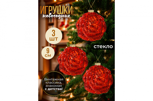 Набор 3 стеклянных новогодних игрушек 9,3*9,3 см "Цветок", красный