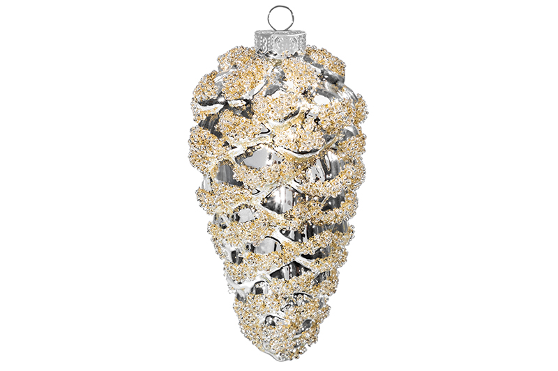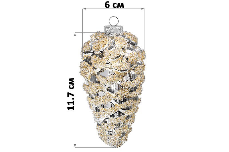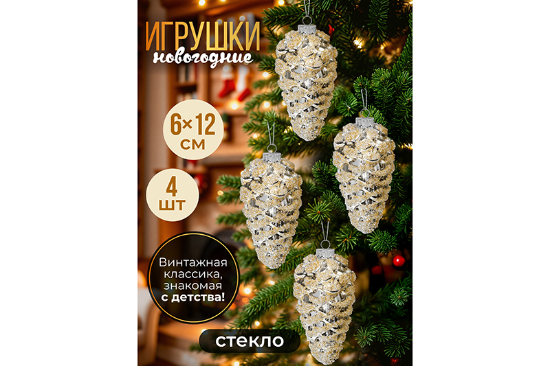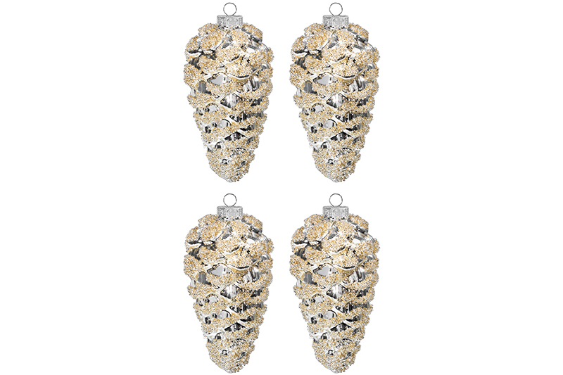Набор 4 стеклянных новогодних игрушек 6*11,7 см "Шишка", белый, серебро с блестками