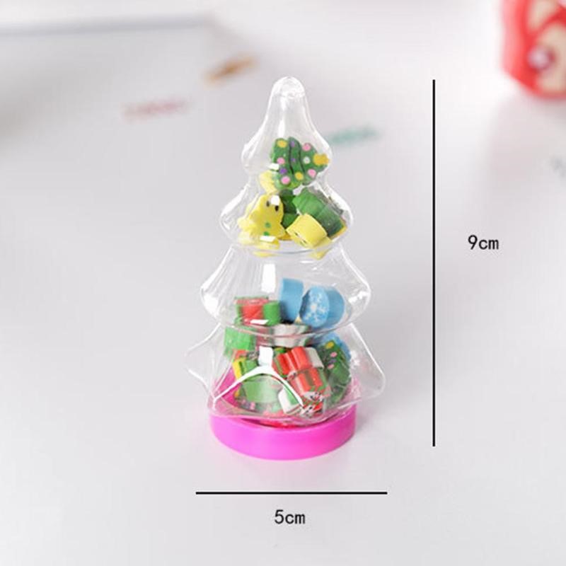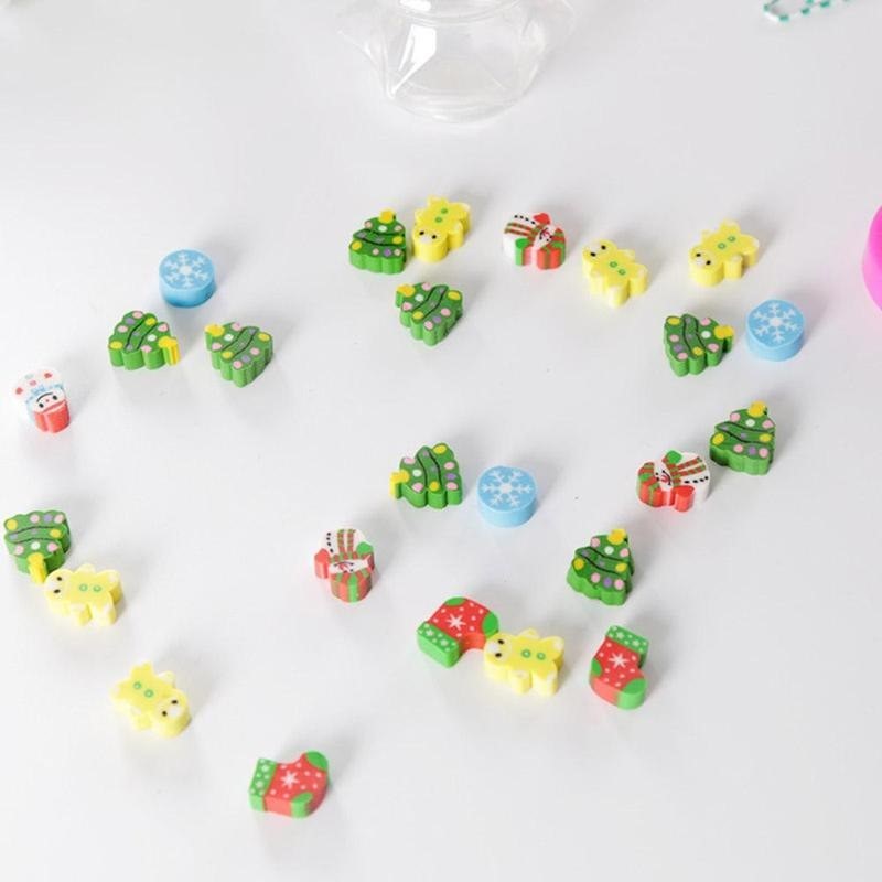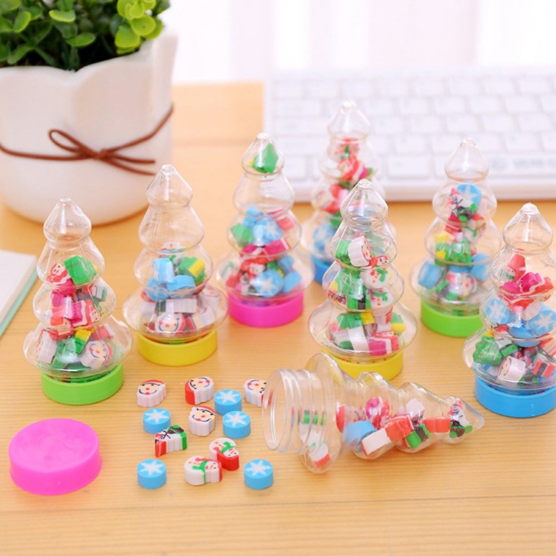 каждой елки ластики с новогодней тематикой: снежинки, снеговики, елочки, Санта-Клаусы, рождественские носки. В каждой упаковке 20 штук. Размер ластика - 1,5