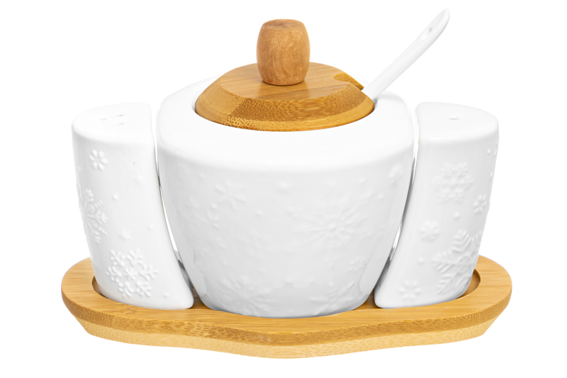 Набор из сахарницы и двух ёмкостей для специй “Снежинки” на деревянной подставке предназначен для организации хранения продуктов на вашей кухне. Размер сахарницы – 10х9х10 см, объём – 300 мл. Размер каждой ёмкости для специй – 4,5х4х6,7 см, объём – 40 мл. Изделия выполнены из высококачественного белого фарфора и украшены рельефом в виде снежинок. В сахарнице также можно хранить мёд, варенье и даже икру. Используйте её для хранения приправ, а ёмкости для специй – в качестве солонки и перечницы, и во время приготовления пищи всё необходимое будет под рукой. Поставьте набор на праздничный стол, чтобы каждый мог дополнить блюда по своему вкусу. Не рекомендуется применять абразивные моющие средства. Ёмкости без бамбуковых элементов можно использовать в посудомоечной машине и микроволновой печи. Бамбук нельзя замачивать. Набор поставляется в красивой картонной упаковке. Он станет прекрасным подарком на Новый год и Рождество и стильным дополнением вашего кухонного инвентаря. Новогодняя серия “Снежинки” отлично подойдёт для сервировки стола в зимние праздники и поможет создать атмосферу уюта.