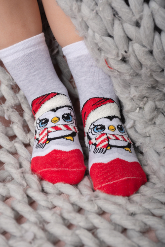 Новогодние детские термо-носки средней посадки с удобной эластичной резинкой, которая не даёт носкам спадать и не сдавливает ногу. Носки внутри утеплены махрой. Мягкие и комфортные.