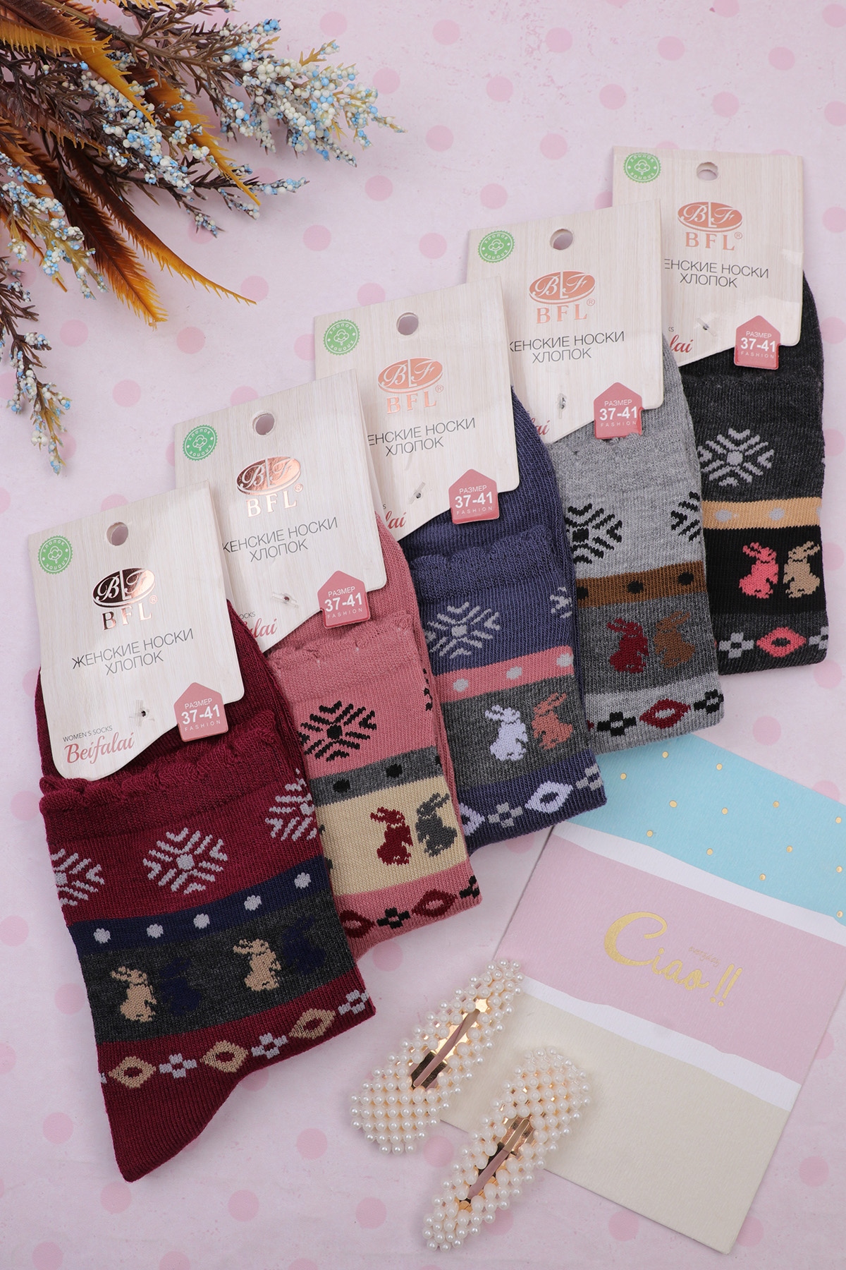 В упаковке 10 пар (разные цвета, рисунки и один размер).