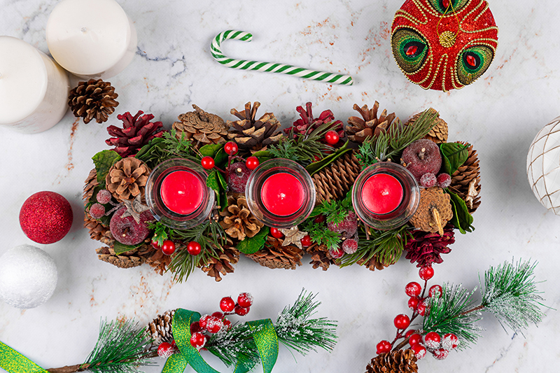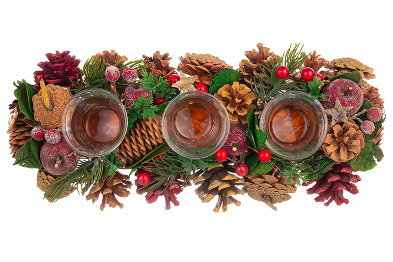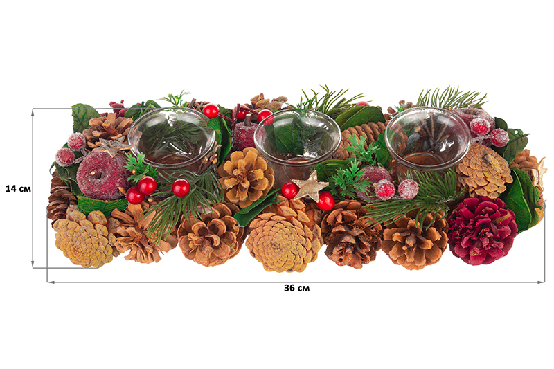 Подсвечник с ёмкостями для трёх свечей “Тайна Рождества” станет идеальным украшением вашего дома на Новый год и Рождество. Размер изделия – 36х14х8 см, диаметр каждого подсвечника – 3,5 см. Ёмкости подойдут как для чайных свечей, так и для свечей-столбиков. Высокие стенки не допустят протечки воска. Необычное декоративное изделие с настоящими сосновыми шишками, пушистыми еловыми веточками и искусственными ягодками подарит вам праздное настроение. Поставьте его на стол, на полку или подоконник, чтобы привнести в дом уют и сказочность. Зажгите свечи и насладитесь неторопливым вечером в компании книги, фильма или душистого напитка, чтобы расслабиться и отдохнуть. Используйте украшение для создания тематических декоративных композиций, чтобы всецело погрузить в атмосферу зимнего волшебства. Подсвечник станет отличным подарком на Новый год и Рождество для семьи, друзей и коллег.