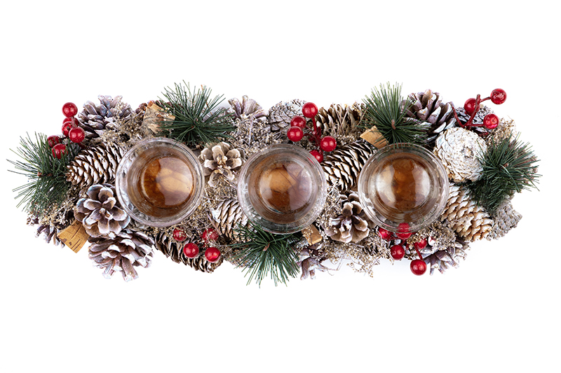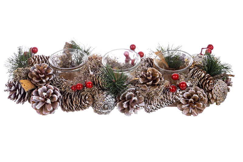 Подсвечник с ёмкостями для трёх свечей “Зимняя вишня” станет идеальным украшением вашего дома на Новый год и Рождество. Размер изделия – 39х15х8 см, диаметр каждого подсвечника – 3,5 см. Ёмкости подойдут как для чайных свечей, так и для свечей-столбиков. Высокие стенки не допустят протечки воска. Необычное декоративное изделие с настоящими сосновыми шишками, еловыми пучками и искусственными ягодками подарит вам праздничное настроение. Поставьте его на стол, на полку или подоконник, чтобы привнести в дом уют и сказочность. Зажгите свечи и насладитесь неторопливым вечером в компании книги, фильма или душистого напитка, чтобы расслабиться и отдохнуть. Используйте украшение для создания тематических декоративных композиций, чтобы всецело погрузить в атмосферу зимнего волшебства. Подсвечник станет отличным подарком на Новый год и Рождество для семьи, друзей и коллег.