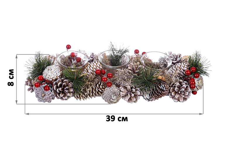 Новогоднее украшение подсвечник 39*15*8 см "Зимняя вишня" на 3 свечи, прямоугольный
