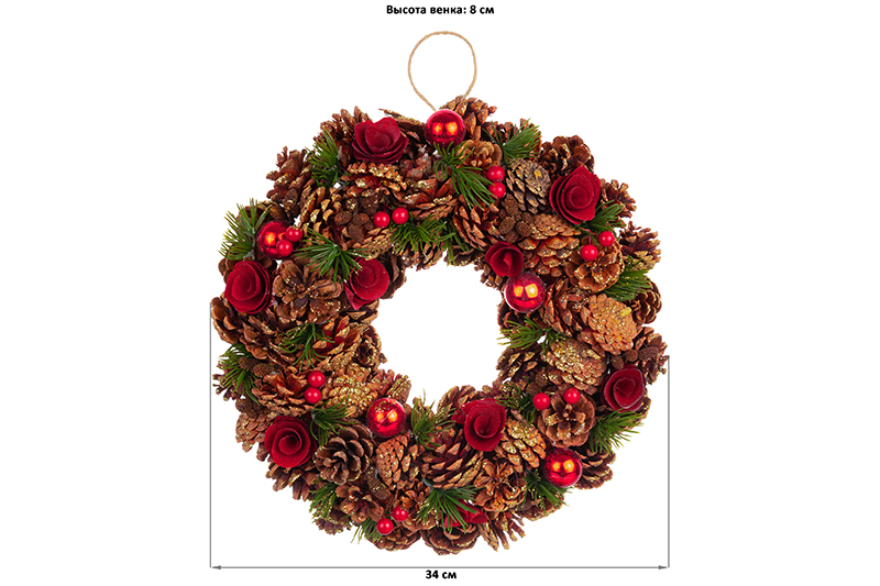 Венок “Санта” станет идеальным украшением на Новый год и Рождество. Размер изделия – 34х34х8 см. Необычное декоративное изделие с настоящими сосновыми шишками и искусственными розовыми бутонами подарит вам праздничное настроение. Поставьте его на полку, стол или подоконник, оперев о стенку или окно. Благодаря прочной петельке его можно повесить на стену, дверь или дверцу шкафа, чтобы привнести в дом уют и сказочность. Прочное основание обеспечит долговечность изделия. Венок найдёт место в любой части вашего дома и украсит интерьер. Используйте его для создания тематических декоративных композиций, чтобы всецело погрузиться в атмосферу зимнего волшебства. Это отличный подарок на Новый год и Рождество для семьи, друзей и коллег.