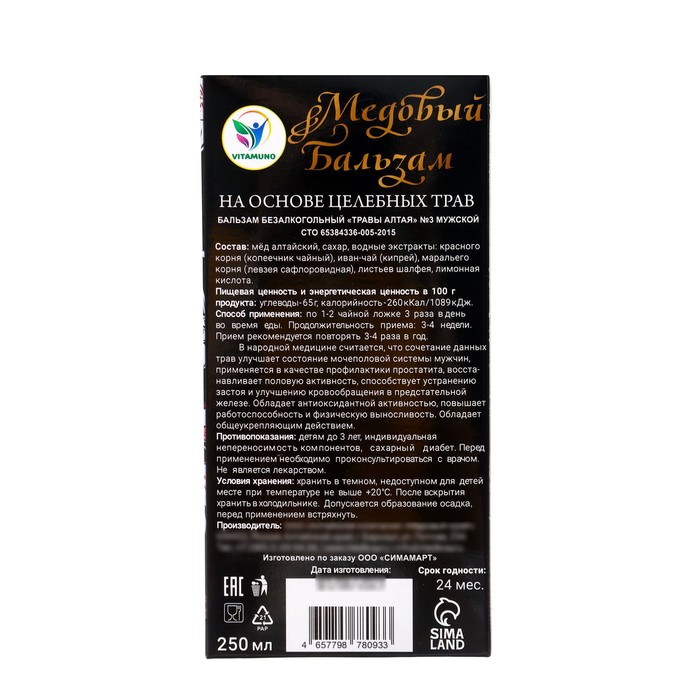 Новогодний безалкогольный алтайский медовый бальзам на травах Vitamuno «Мужской», 250 мл
