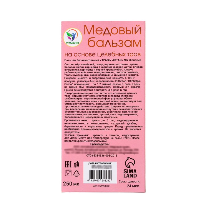 Новогодний безалкогольный алтайский медовый бальзам на травах Vitamuno «Женский», 250 мл