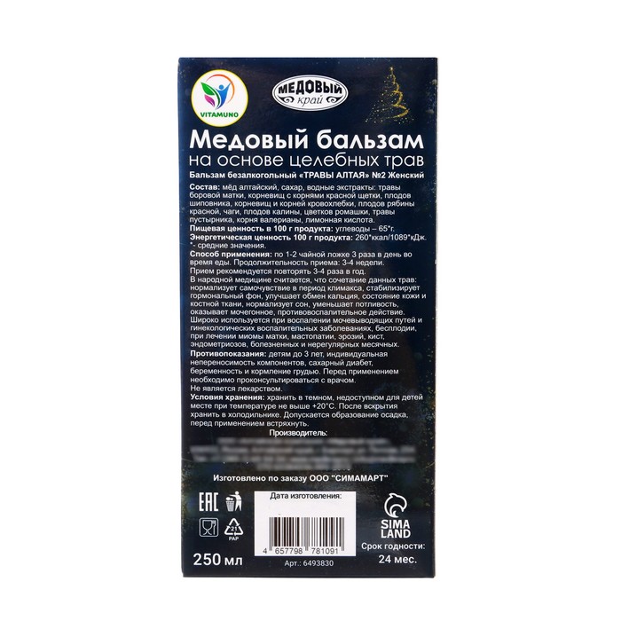 Новогодний безалкогольный алтайский медовый бальзам на травах Vitamuno «Женский», 250 мл