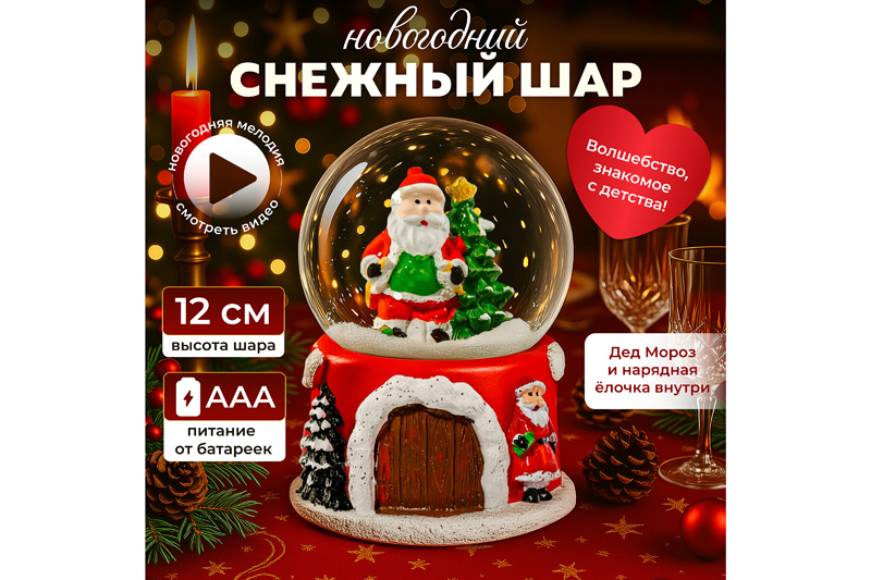Музыкальный светящийся новогодний шар со снегом "Дед Мороз на лыжах" от Elan Gallery – это маленькое путешествие в дивный мир зимней сказки. Размер 8х8х12,5 см. Внутри прозрачного стеклянного шарика расположена фигурка Деда Мороза, нарядная ёлочка, а также декор в виде снежных хлопьев. Работает от 3 батареек ААА. Отсек для батареек и миниатюрный выключатель находятся с обратной стороны подставки, которая соприкасается со столом. При включении шар играет подсветкой разнообразных цветов и проигрывает рождественскую мелодию. Волшебный шарик выполнен из стекла, основание композиции и фигурки внутри – из полирезина. Это современный материал, который славится своей износостойкостью. Легко поддаётся обработке, поэтому изделия из него отличаются высокой детализацией. Поставьте милую настольную фигурку с музыкой на комод, полку или возле компьютера, чтобы добавить интерьеру дух любимых зимних праздников. Не рекомендуется применять абразивные моющие средства. Оригинальная игрушка в стиле винтаж станет прекрасным сувениром на память и отличным подарком для друзей и близких. Благодаря яркому дизайну фигурное декоративное изделие понравится ребёнку, подростку или взрослому. Подойдёт как девочке, так и мальчику. Оно послужит предметом декора для вашего дома. Поставляется в красной картонной коробке – благодаря ей вам не потребуется дополнительная подарочная упаковка. Интерьерное украшение от бренда Элан Галерея поможет вам погрузиться в атмосферу Нового года, Рождества и наполнит дом уютом и светлой праздничной магией. В коллекции бренда представлено много красивых статуэток и игрушек с Санта-Клаусом, Дедом Морозом и другими новогодними персонажами. Выберите вариант на свой вкус!