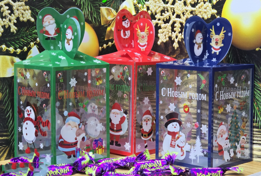 Откройте для себя очаровательные пакетики, которые станут идеальным оформлением для ваших сладких подарков! Эти удивительные упаковки в виде куба с дизайном в стиле бантика с оленем и Дедом Морозом добавят волшебства в каждую деталь.Изготовленные из высококачественного прозрачного ВХ-пластика, эти пакеты не только красивы, но и надежны.идеально подходящих для праздничного оформления. Идеально подходит для конфет и небольших подарков!