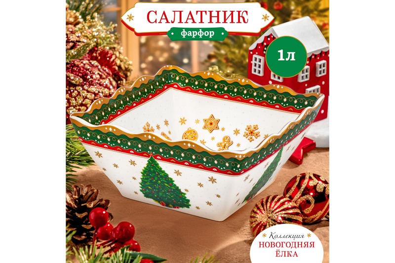 Салатник Elan Gallery "Новогодняя ёлка" выполнен из фарфора нового поколения new bone china, сочетающего в себе изящность и высокую прочность. От классического костяного фарфора new bone china отличается большей экологичностью в производстве. Размер блюда – 16x16x8 см, объём – 1 литр. Дизайнерская коллекция посуды от бренда Elan Gallery украшена изображением пушистой ёлочки и узором из имбирных пряников и снежинок. Она создаст в вашем доме атмосферу волшебства и подарит праздничное настроение. Салатница квадратной формы займёт отличное место в вашей коллекции фарфоровой посуды. Снаружи украшена рисунком в виде ёлочек и снежинок. Внутри украшена орнаментом в виде имбирных пряников и рисунком ёлочки на дне. Имеет волнистые края. Используйте тарелку для любых закусок и угощения гостей на празднике или вечеринке. Подойдет не только для салатов, можно использовать для сервировки любых сладостей, например, конфет или печенья. Положите в фарфоровую ёмкость фрукты или овощи, чтобы порадовать гостей. Благодаря глубокой форме прямоугольную миску можно использовать под любые гарниры. Кухонный инвентарь станет незаменимым помощником при сервировке стола и предметом декора вашего дома. Не рекомендуется применять абразивные моющие средства. Подходит для использования в микроволновой печи и посудомоечной машине. Поставляется в стильной картонной упаковке. Подарочное фарфоровое блюдо порадует ваших близких на любой праздник. Благодаря яркой коробочке вам не нужно искать дополнительную подарочную упаковку. В серии вы найдёте все необходимое, чтобы встретить Новый год и Рождество в тёплом семейном кругу. В коллекции бренда Элан Галерея можно найти много красивого кухонного и столового инвентаря, а также собрать сервиз на свой вкус. /