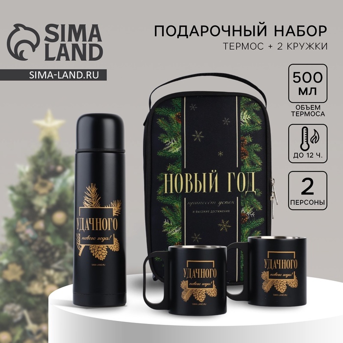 Набор «Удачного Нового года» — идеальный подарок для людей любого возраста. В него входят термос на 500 мл и две кружки с сдержанным и стильным новогодним дизайном.