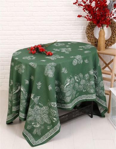 Скатерть Премиум "Зимние птицы"-зелен. 150*220 см. п/лен