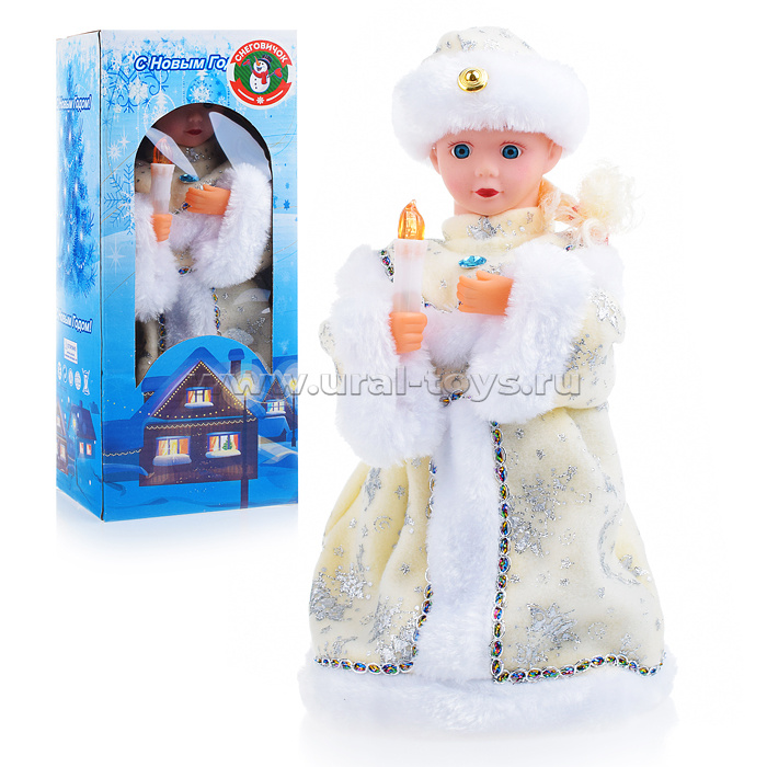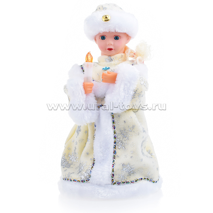 Снегурка со свечой в белой шубе, музыкальная 30см в коробке