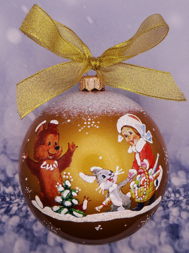 Двусторонний стеклянный елочный шар диаметром 85 мм. Одна сторона шара уже с нанесенным изображением новогодней тематики представленным на фото, другая сторона для Вашего пожелания (имени, поздравления).