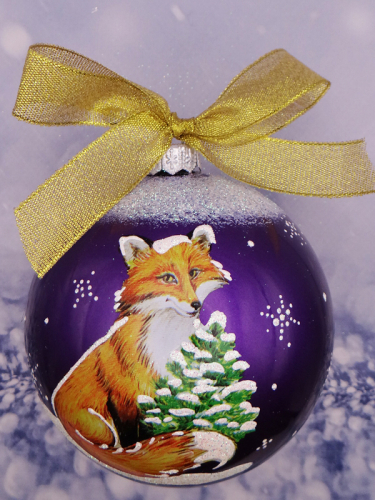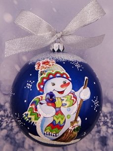 Двусторонний стеклянный елочный шар диаметром 100 мм. Одна сторона шара уже с нанесенным изображением новогодней тематики представленным на фото, другая сторона для Вашего пожелания (имени, поздравления).
