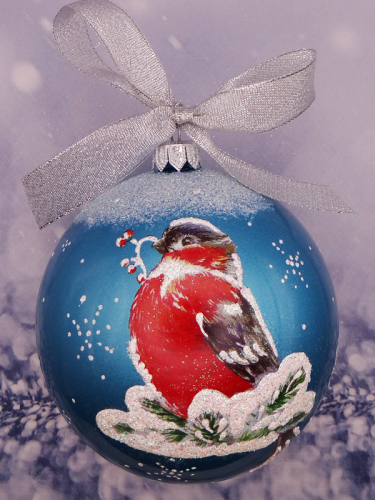 Двусторонний стеклянный елочный шар диаметром 100 мм. Одна сторона шара уже с нанесенным изображением новогодней тематики представленным на фото, другая сторона для Вашего пожелания (имени, поздравления).