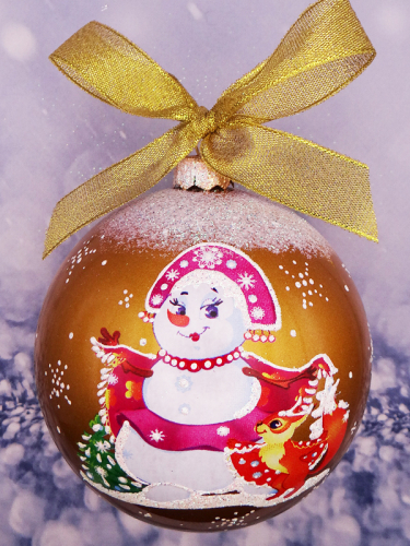 Двусторонний стеклянный елочный шар диаметром 100 мм. Одна сторона шара уже с нанесенным изображением новогодней тематики представленным на фото, другая сторона для Вашего пожелания (имени, поздравления).