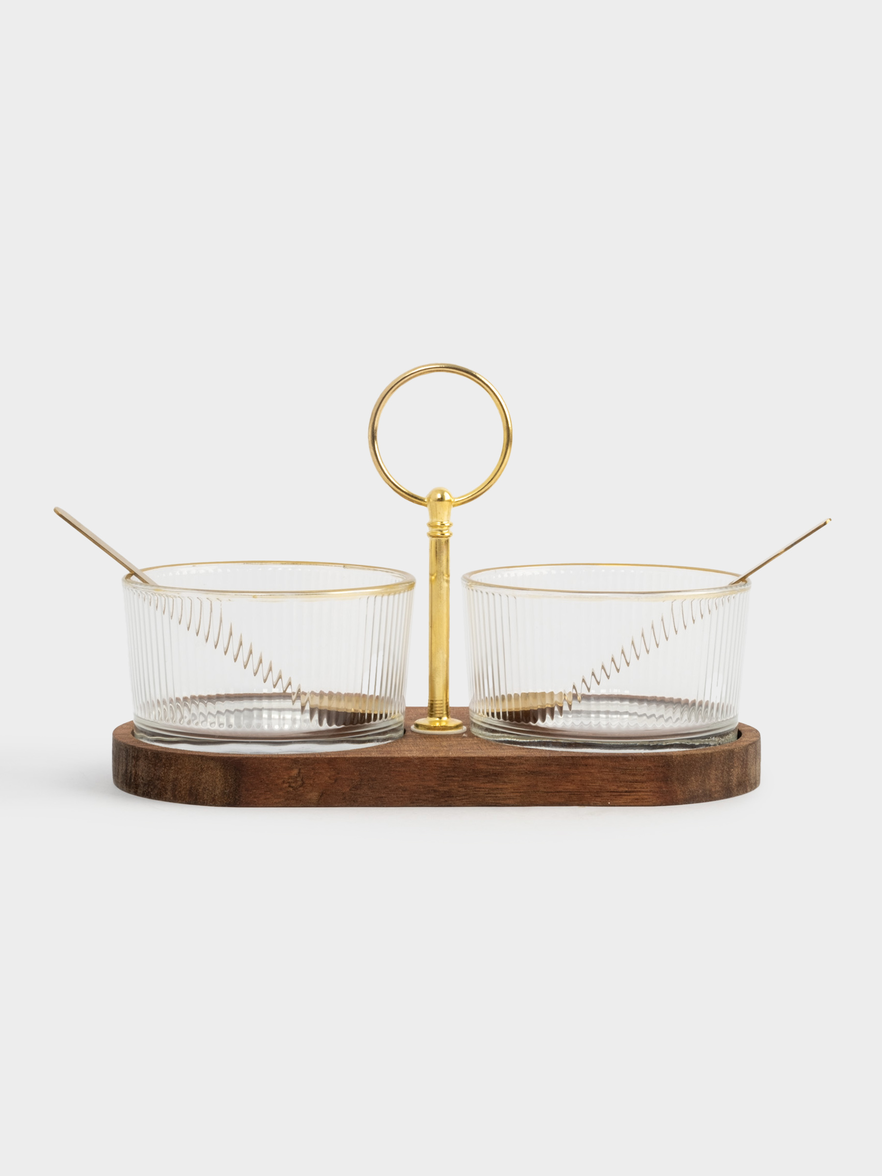 Вазочка для джема, 20x10 см, 2 шт, с ложками, на подставке, стекло/дерево/нержавеющая сталь, золотистая, Sonnet