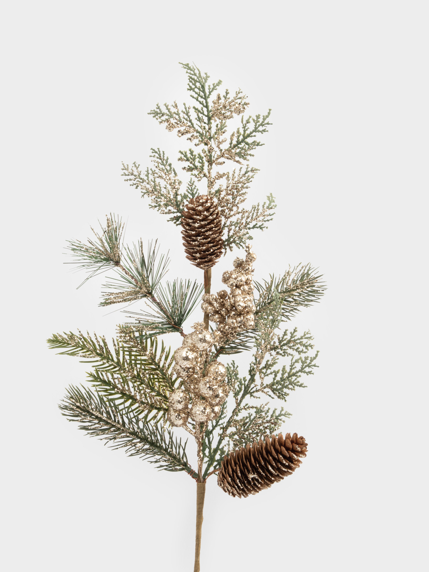 Ветка декоративная. Размер: 62 см. Материал: пластик, пенопласт, шишки, металл, бумага. Предназначена для декорирования интерьера. Рекомендуется сухая чистка.