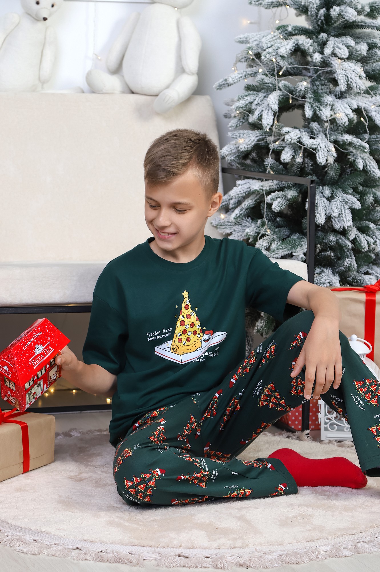 Костюм для мальчика. Футболка с принтом; модель свободная, со спущенной линией плеч. Брюки из полотна эксклюзивного дизайна, прямые, с боковыми карманами, на притачном поясе с отстроченной эластичной тесьмой.