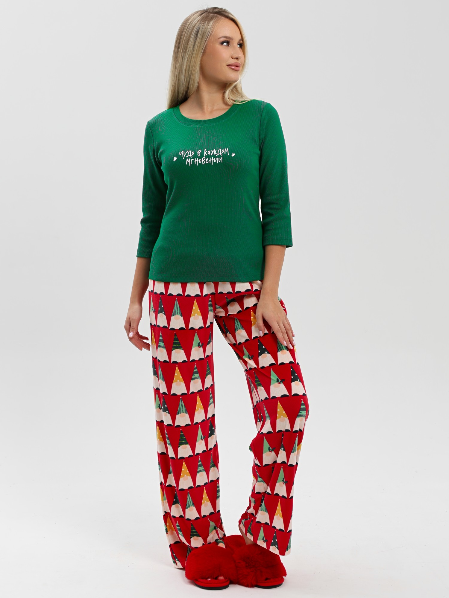 Костюм молодежный в комбинации двух видов полотен: из трикотажного полотна «кашкорсе» и «велюр стрейч», состоящий из футболки и брюк. Футболка - из гладкокрашеного трикотажного полотна «кашкорсе» классического покроя, с втачными рукавами длиной до локтя, горловиной овальной формы, обработанной втачной планкой и принтом на полочке, выполненным в технике «шелкографии».Брюки – из трикотажного полотна «велюр стрейч» с набивным рисунком, длинные, свободные, на притачном поясе с эластичной тесьмой внутри.