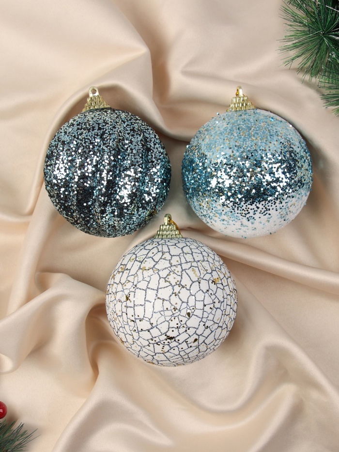 Набор из 3 пластиковых ёлочных шаров диаметром 8 см представлен в бело-синей гамме с рисунком в стиле шебби-шик. Эти украшения подчёркивают нежность и винтажную эстетику новогоднего декора, добавляя изысканности и уюта праздничной атмосфере.