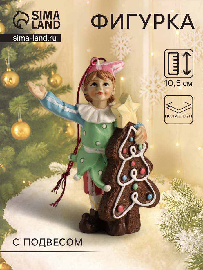 * Детализированный образ эльфа: Фигурка изображает сказочного помощника Санты с милым лицом и в традиционном костюме. В руках эльф держит маленькую имбирную ёлочку — символ уюта и зимних праздников.